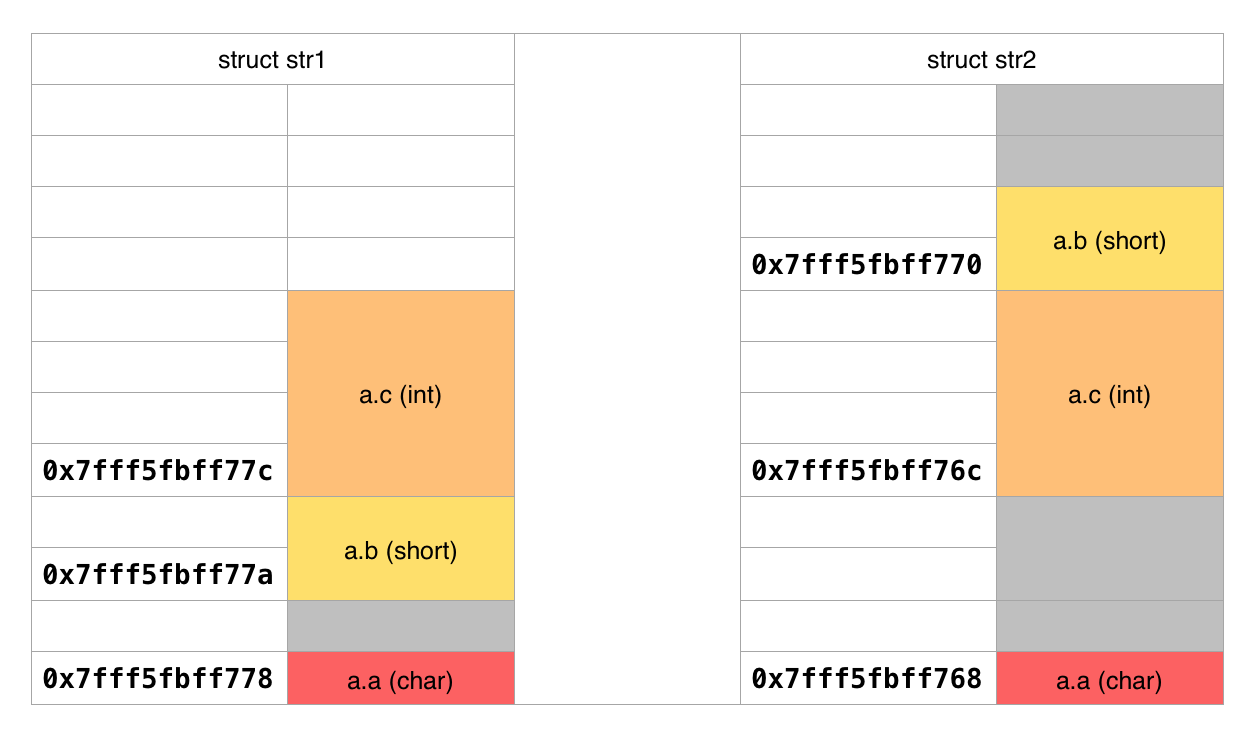 灰色表填充用来对齐,保证最后结构体大小是最长的成员的大小的整数倍。
