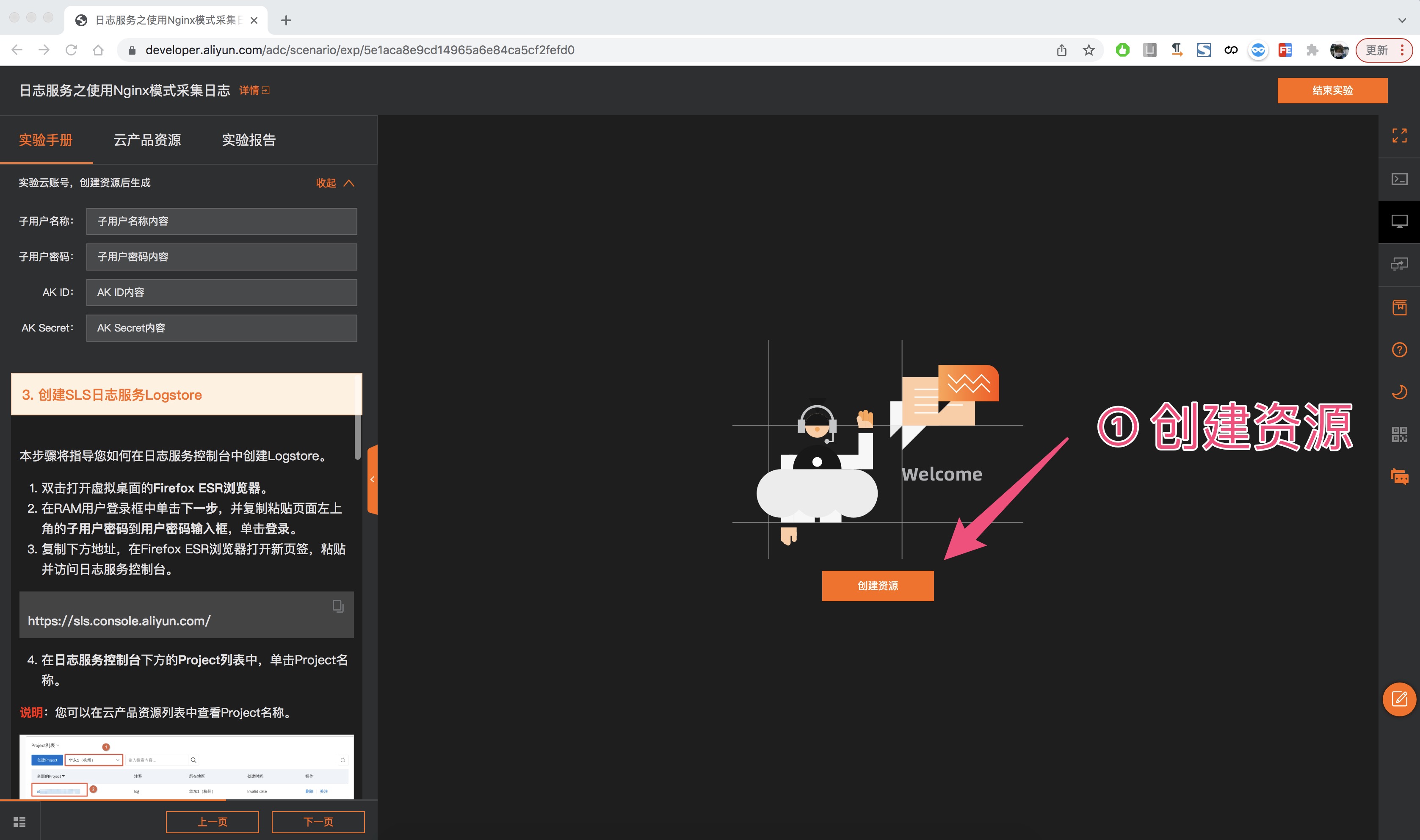 点击创建资源,然后系统会根据后台的配置,首先分配一个子账号,然后在这个子账号下面分配云资源,比如这个场景,采集 nginx 日志到 sls ,所以会分配一台 ecs 并且开通 sls 服务。